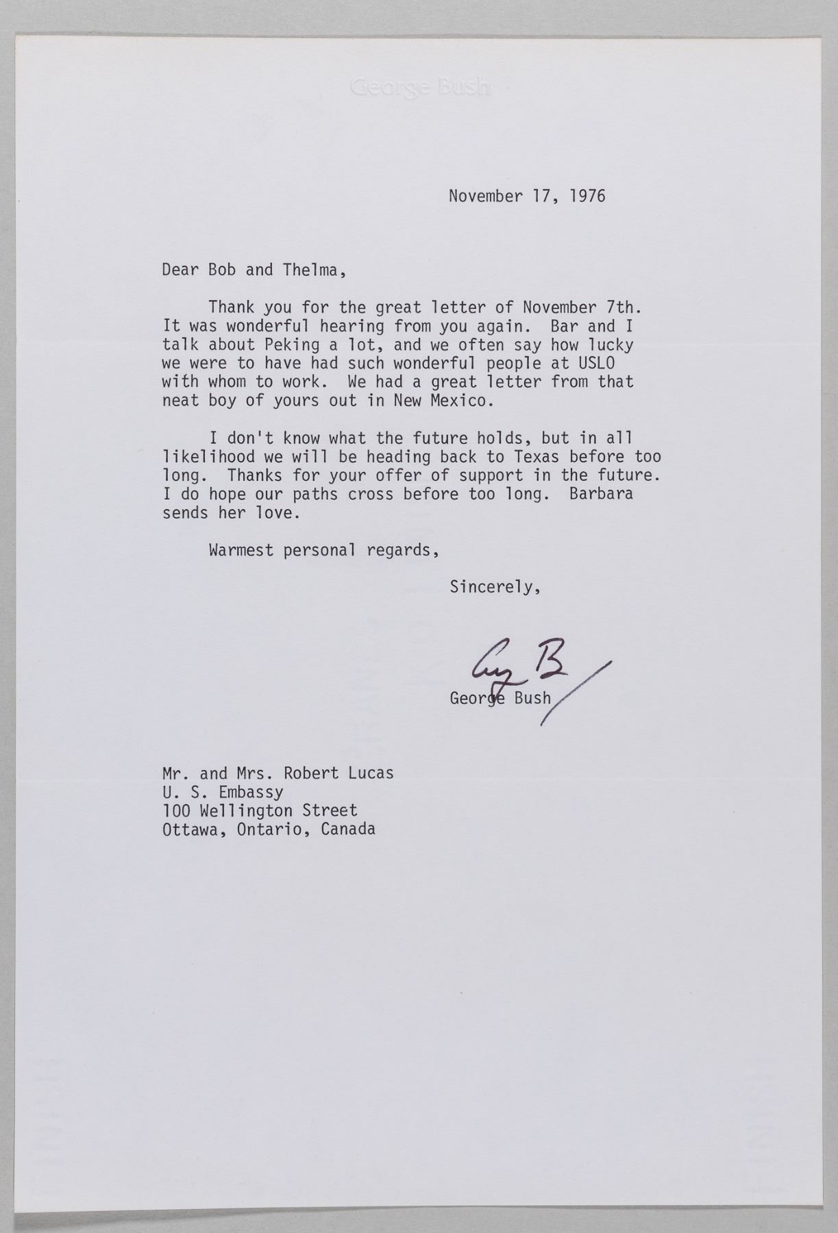 (1924-2018) 41st president of the United States from 1989 to 1993. T.L.S. on his blind embossed personal letterhead, November 17, 1976, one page, 7.25 x 10.5 inches, to Robert Lucas at the U.S. Embassy in Ottawa, in part: 'Bar and I talk about Peking a lot, and we often say how lucky we were to have had such wonderful people at USLO with whom to work...I don't know what the future holds, butin all likelihood we will be heading back to Texas...' Signed in black ink at conclusion. Mailing folds. Very good.