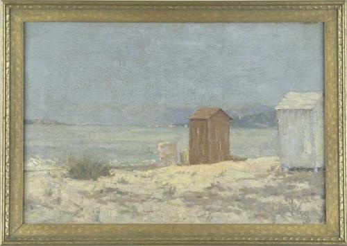 GEORGE HENRY LEONARD (American, 1869-) FRENCH COAST WITH BATH HOUSES. Oil on canvas scene shows several bath houses along a turquoise sea with grass covered sandy beach. Signed lower left. Partial label from the Pennsylvania Academy of the Fine Arts Sixty-Seventh Annual Exhibition. J. H. Miller Co. label on stretcher. Housed in a gilt molded wood frame. SIZE: 16" x 23-1/2". CONDITION: Very good. 8-87332