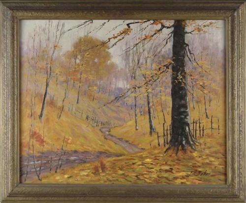 GEORGE HERBERT BAKER (American, 1878-1943) FALL LANDSCAPE RICHMOND, INDIANA. Oil on masonite fall scene shows a dirt road winding through woods with colorful foliage. Signed lower right "G H Baker". Housed in a period decorated molded wood frame. Title written on back "Scene off Richmond, Newcastle Rd NW of Richmond, Indiana" and dated November 8, 1941. SIZE: 24" x 30". CONDITION: Very good. 9-27783