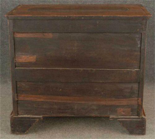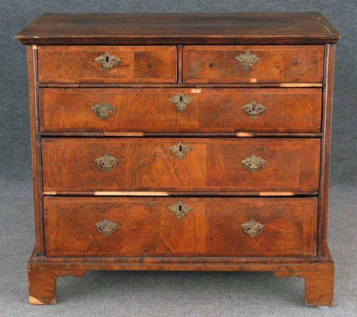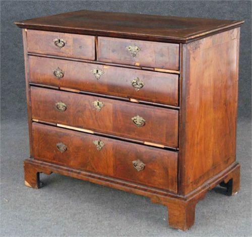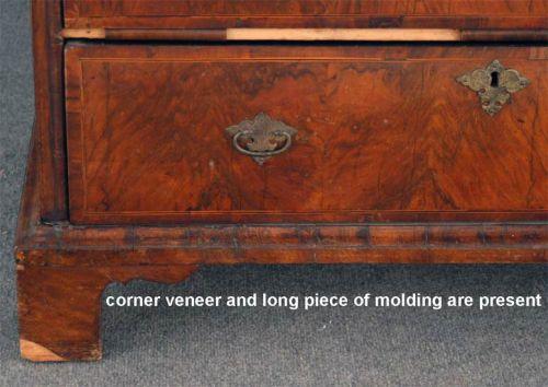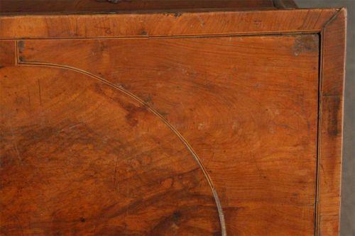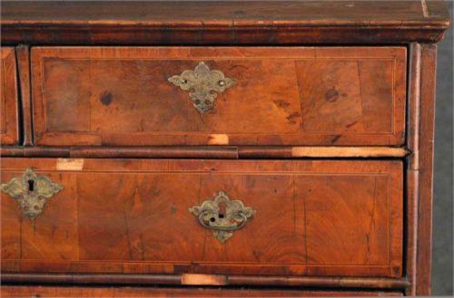DRAWERS, crossbanded with <BR> double line inlay, <BR> early 18th century <BR> condition: veneer patch to top right drawer, replaced hardware with plugs showing- particularly top drawers, various molding losses (most larger pieces present, but detached)veneer lifting in spots <BR> shipping: this lot must be handled by 3rd party shipper. Do not contact us for estimates. We recommend: <BR> The UPS Store, Newtown, CT, store1324@theupsstore.com <BR> Vintage Transport (for furniture), Atlanta GA, info@vintagetransport.com <BR>