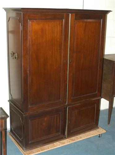 GEORGE III MAHOGANY CAMPAIGN OR SHIP CAPTAIN'S MAP CASE, in two parts, originally fitted with numerous shelves which are now lacking, dust panel between top and bottom lacking, late 18th century, SHIPPING: See recommended third party shippers. This ite