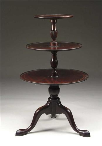 GEORGE III MAHOGANY INLAID THREE TIER DUMB WAITER. Each tier with dish top and inlaid circular band. The central post with urn carved base having three outstretching snake legs with pad feet and inlaid flower decorated knees. The top two posts have ribbed carved urns. SIZE: 42” h x 25” w. CONDITION: Very good. 9-27151