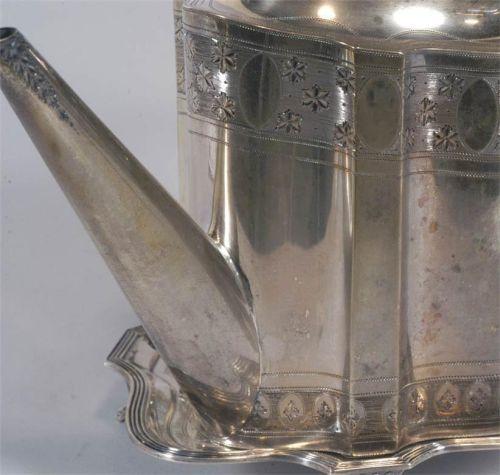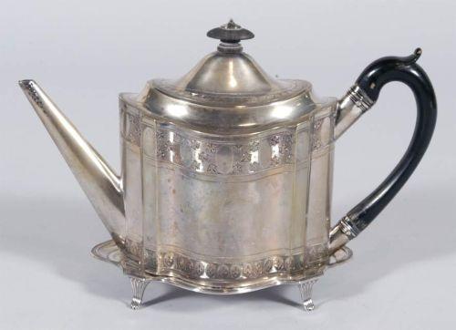 GEORGE III STERLING TEA POT AND STAND hallmarked Peter & Ann Bateman, London, 1796, 6 3/4" high, 612 grams, CONDITION: wooden handle has chip to spur, PACKING AND SHIPPING BY FAIRFIELD AUCTION WITHIN CONTINENTAL USA (excluding insurance) $30,