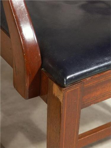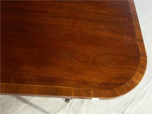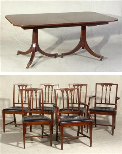 DINING TABLE AND CHAIRS: Sloanemaster Furniture George III style mahogany dining table and six chairs, table with two leaves, oval table with crossbanding, double block pedestals each with three downswept legs, brass caps and casters; two arm and four side chairs, each with navy leather seat, carved back, string inlay; table measures 29''h x 22''d x 72''w, leaves measure 16''each.
