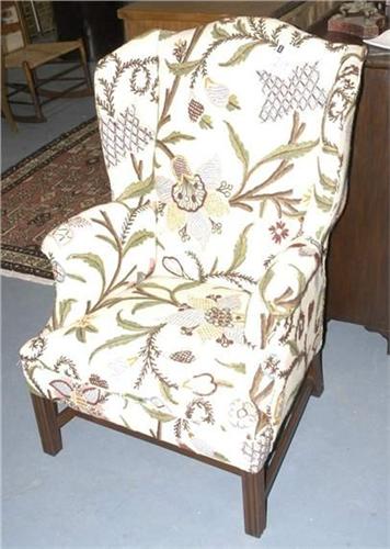 GEORGE III STYLE WINGBACK CHAIR with crewel work upholstery,41" high, CONDITION: upholstery stained.