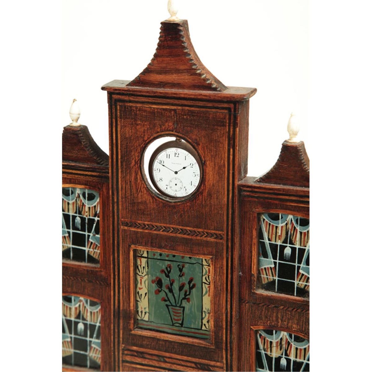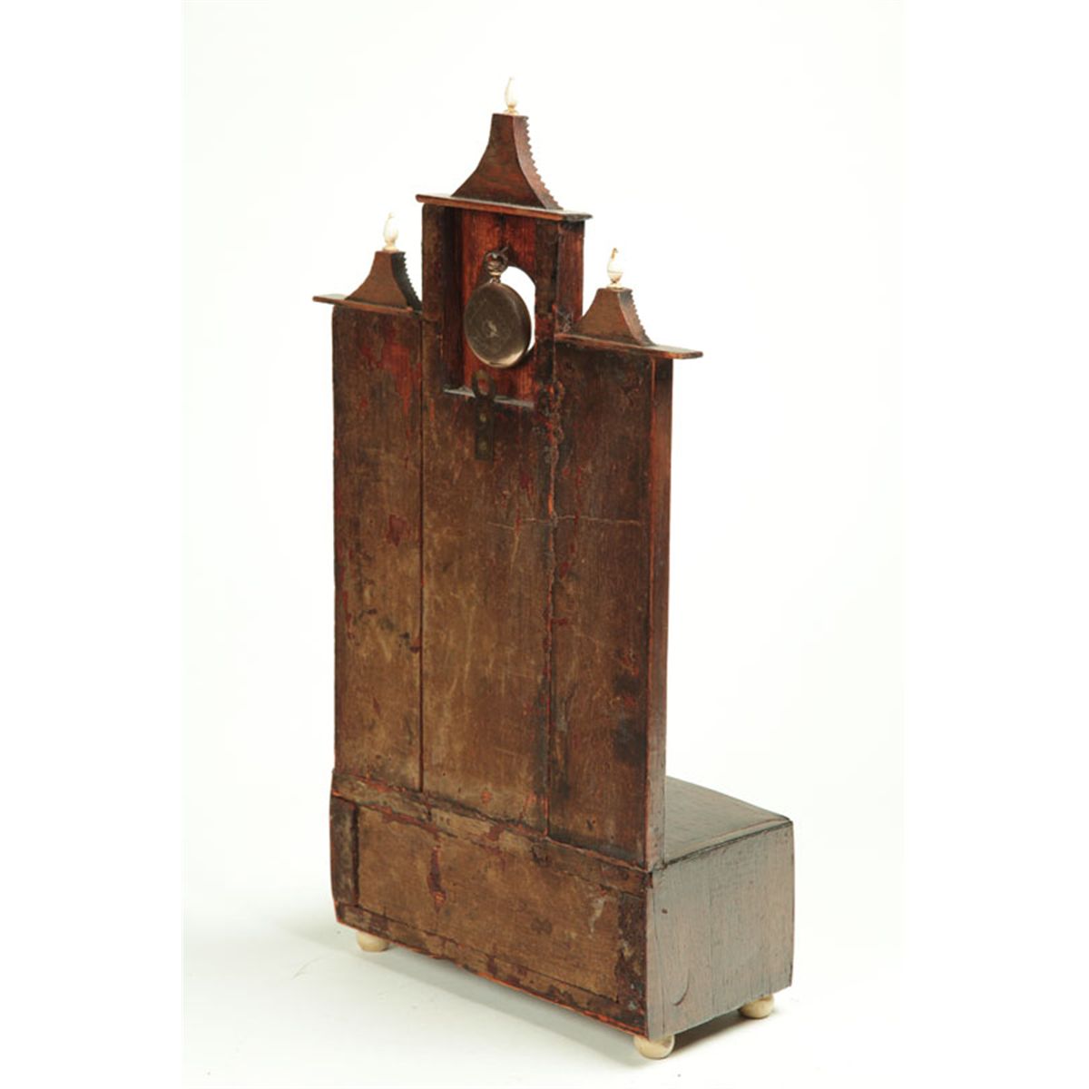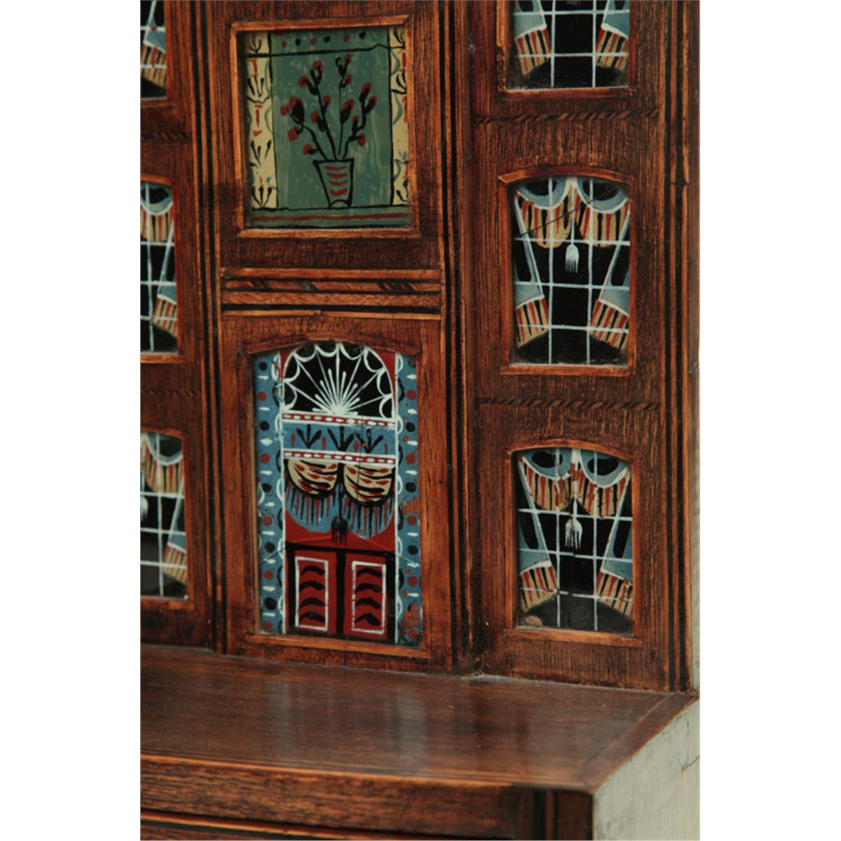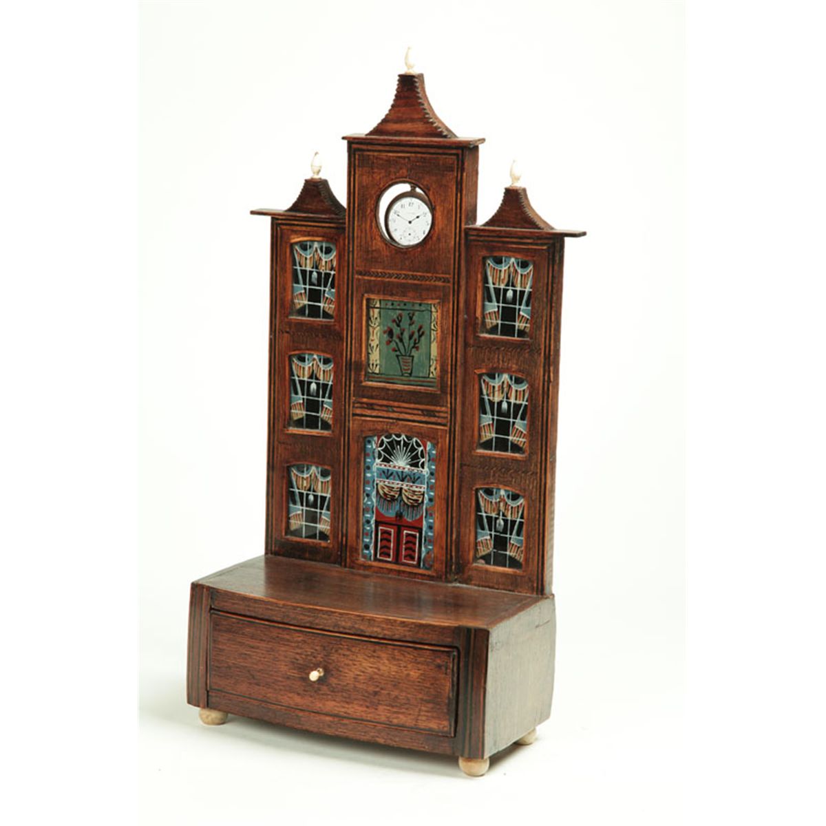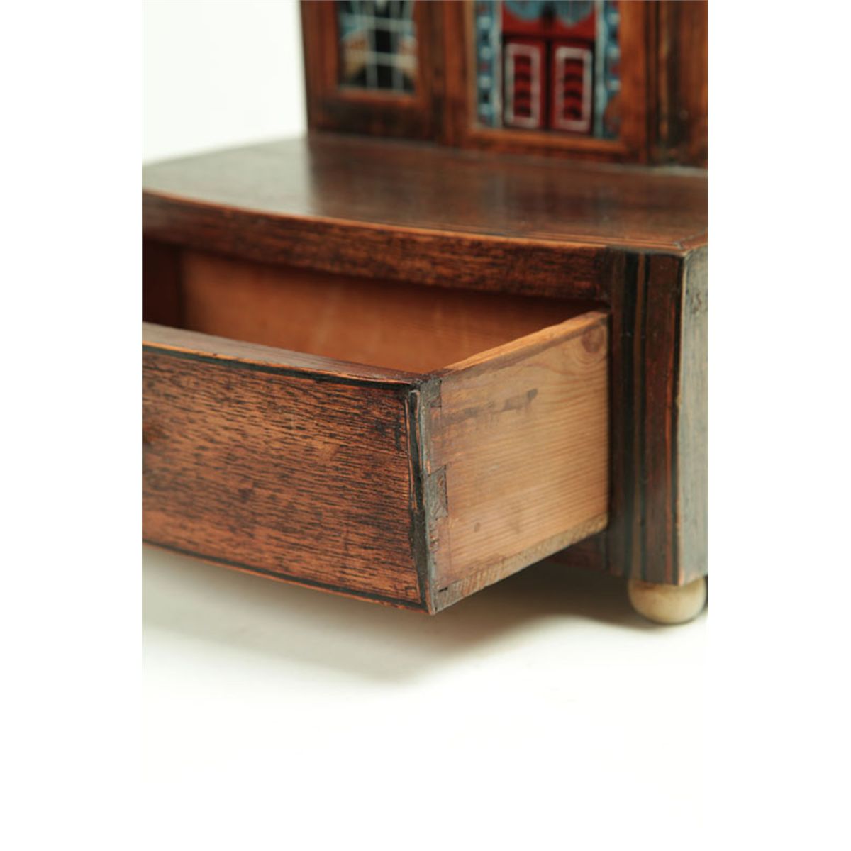 England, late 18th-early 19th century, oak. Elaborate hutch with eight reverse-painted glass panels inset in an inlaid, architectural back with ivory finials, resting on a bowfront drawer. Old finish. Minor damage. 20 1/2"h. 10 1/4"w. 5"d. Sold at Garth's, 1994.