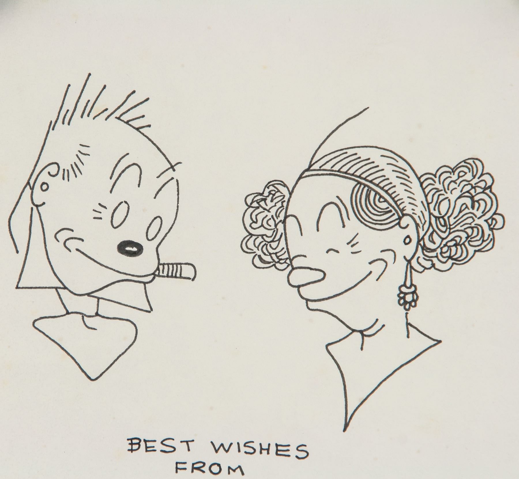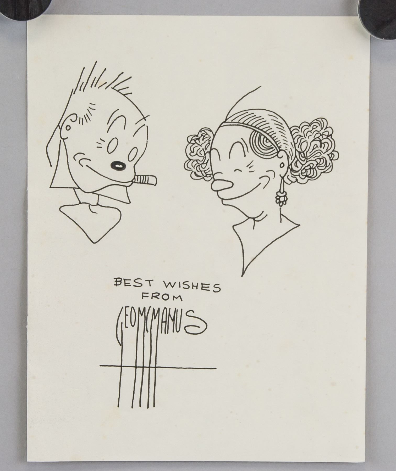 Ink on paper. Signed and attr George McManus (American, 1884-1954). 6.9 x 5.3 in. (17.5 x 13.5 cm). George McManus was an American cartoonist best known as the creator of Irish immigrant Jiggs and his wife Maggie, the main characters of his syndicated comic strip, Bringing Up Father. PROVENANCE: Private Collection (South America)