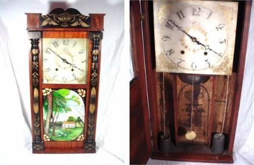 GEORGE MITCHELL OF BRISTOL; MANUFACTURED FOR MITCHELL; STENCIL COLUMN AND SPLAT; ALL STENCILLING REDONE; FRONT TABLET REDONE; DIAL BADLY WORN; TIME AND STRIKE WOODEN WORKDS 30 HR. 1819-1827 AMERICAN CLOCKS VOLUME III BY TOM SPITTLER. 35.5"X16.5"X5.5". VALUATION: 400-500 USD.