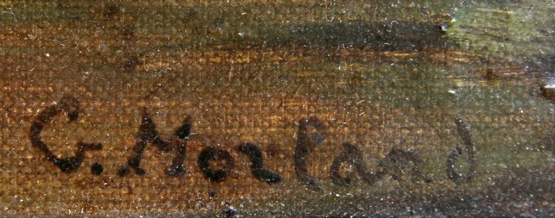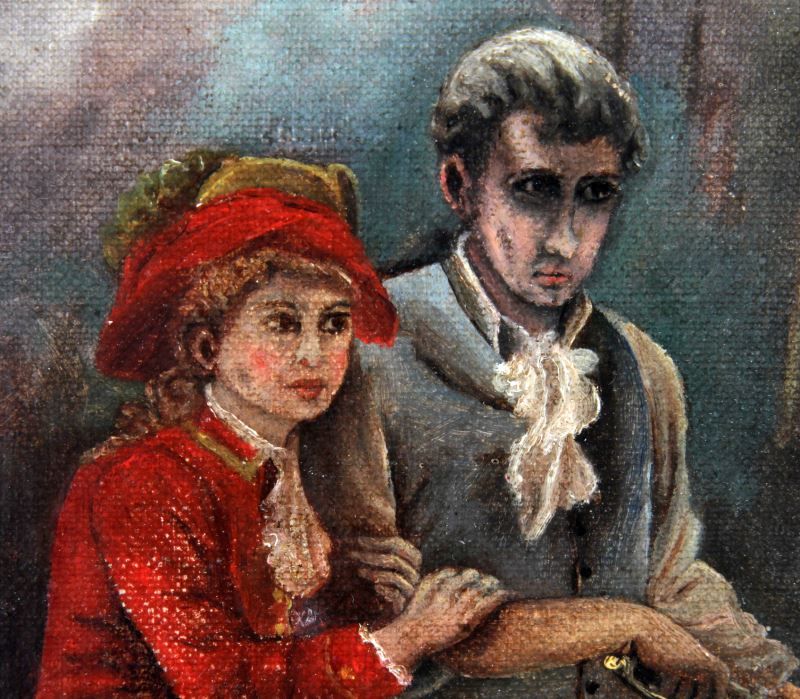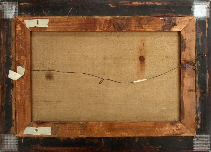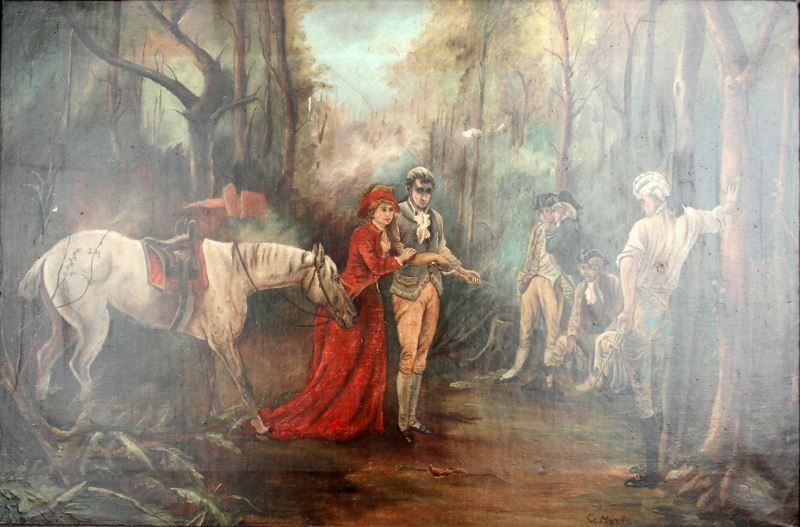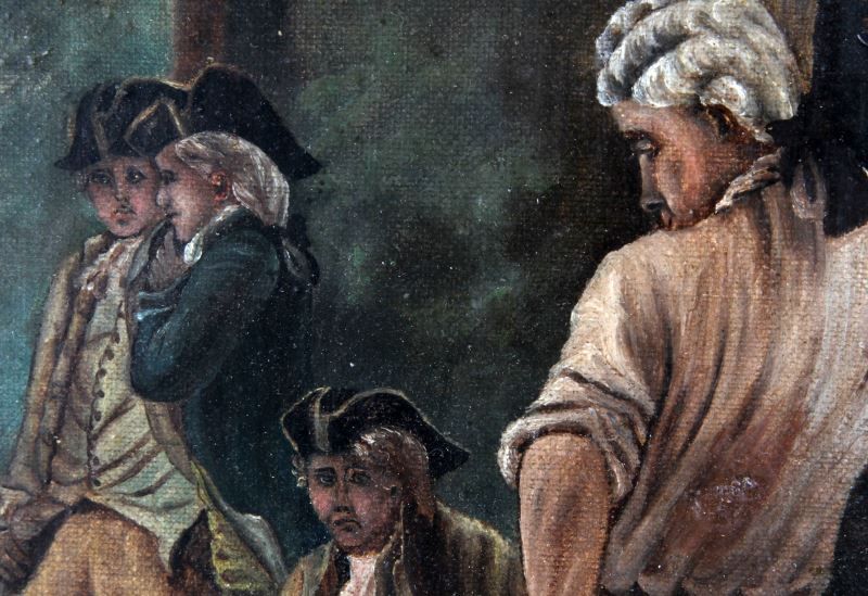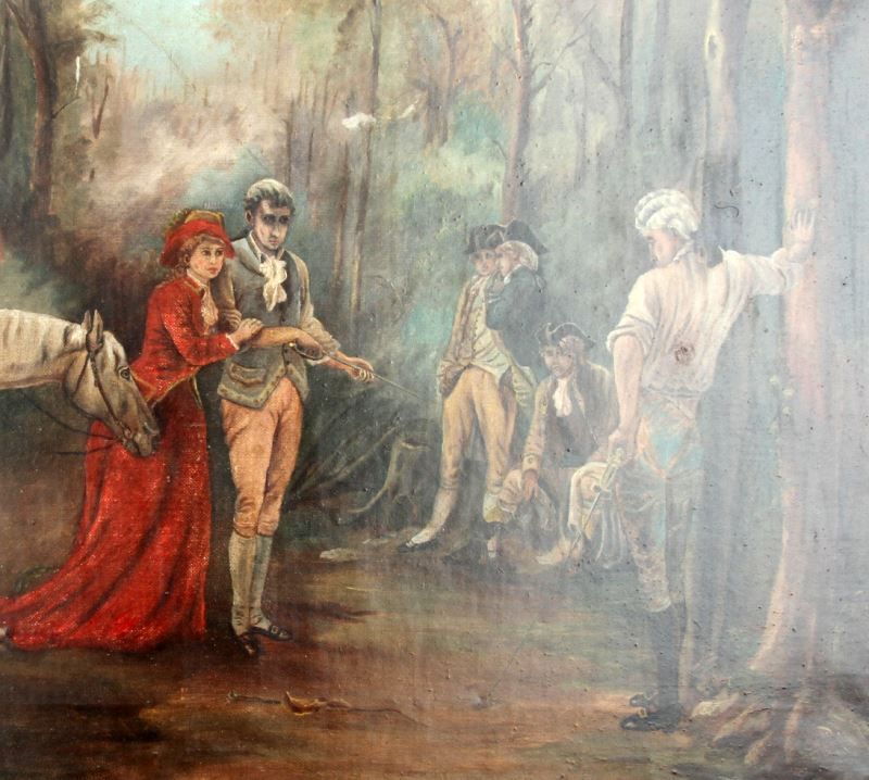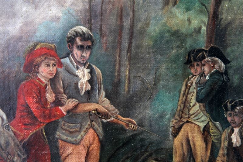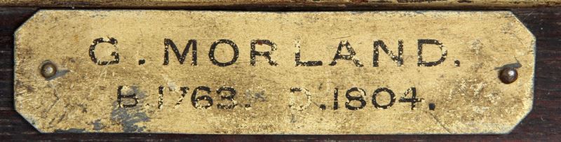 George Morland (English, 1763-1804). Colonial military duel scene with signature (G. Morland) LR. Stretcher is 16 by 24 inches and overall framed size is 21 by 29 inches. Period oak frame. Overall in very good condition with a few minor scuffs to varnish overcoat. Frame corners have been reinforced on back. This lot has a reserve