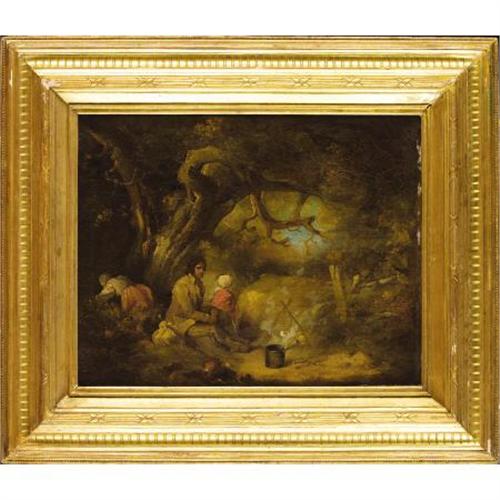 <B>GEORGE MORLAND (British, 1763-1804)</B></I><BR><I>Gypsy Encampment</B></I>, 1791<BR>Oil on canvas<BR>23-1/4 x 28-3/4 inches (59.1 x 73.0 cm)<BR>Signed and dated lower left: <I>G. Morland / 1791</B></I><BR> <BR>PROVENANCE:<BR>Sir Walter Gilbey, Bart., Elsenham Hall, Essex, England, 1897;<BR>Private collection, New York.<BR><BR>LITERATURE:<BR>R. Richardson, <I>George Morland's Pictures: Their Present Possessors, with Details of the Collections</B></I>, London, 1897, p. 21, no. 10 "Gipsy Encampment, 2 feet 1/2 in. x 2 feet 5 1/2 in., signed, 1791" (one of 24 works by Morland in the collection of Sir Walter Gilbey).<B>Condition Report:</B> Canvas has been relined, some abrasion along edges due to frame, craquelure throughout, surface dirt, otherwise good condition.<BR><BR><b>Shipping:</b> Requires 3rd Party Shipping (<a target="_blank" href="http://www.heritageauctions.com/common/shipping.php">view shipping information</a>)