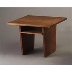 GEORGE NAKASHIMA Portsmith walnut end table with square plank top, tapering sides and lower shelf. Marked Duquesne Univ. 21" x 27 3/4" sq. $4,000-6,000