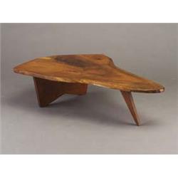 GEORGE NAKASHIMA walnut coffee table with organic free-edge top with one plank leg and one flaring leg. (Provenance available.) Unmarked. 13" x 51" x 35 3/4" $6,000-8,000