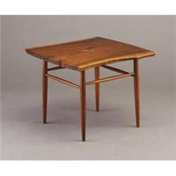GEORGE NAKASHIMA walnut occasional table with free edge and single rosewood butterfly key on dowel legs and stretchers. (Provenance available.) Marked with client's name. 27 3/4" x 27 1/4" x 27 1/ 4" $2,500-3,500