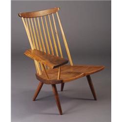 GEORGE NAKASHIMA walnut spindle-back lounge chair, 1978, with single free-edge arm and broad saddle seat. (Yukari Takahashi Simonds Collection). Signed George Nakashima/February 1978 and original owner's name. 31 1/2" x 31" x 26" $2,000 - 3,000