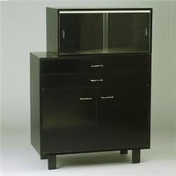 GEORGE NELSON for HERMAN MILLER black lacquered cabinet with two drawers over two doors, all with chrome wire pulls and matching wall mounted cabinet with two sliding glass doors. Herman Miller foil label. 39 1/2" x 40" x 18 1/2" and 16" x 34" x 18 1/2" $800 - 1,200