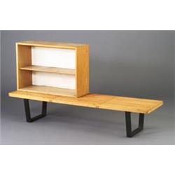 GEORGE NELSON for HERMAN MILLER blond-wood slatted bench on an ebonized base with a blond-wood veneer open book/display case with single adjustable shelf. Normal wear. Bench: 14" x 72" x 18 1/2" Bookcase: 24" x 34" x 12" $500 - 700