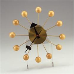 GEORGE NELSON for HOWARD MILLER "Ball Clock," with spun brass center, enameled hands, and spherical walnut numeral markers. Unmarked. 13" dia. $400 - 600