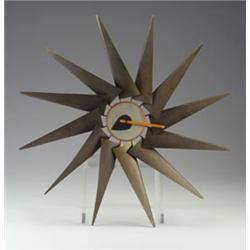 GEORGE NELSON for HOWARD MILLER wall clock (no. 2240) with patinated brass fins and enameled hands in orange and black. Several dents. Marked HOWARD MILLER CLOCK CO./2240 31 1/2" dia. $800 - 1,200