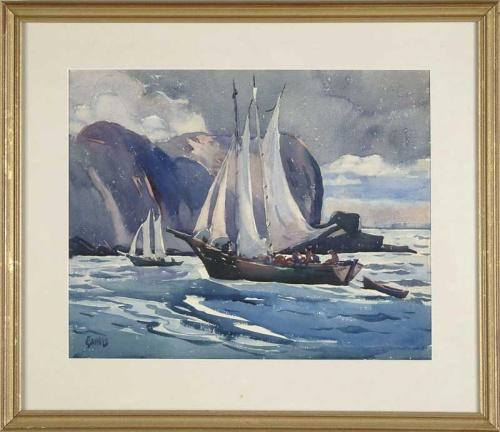 GEORGE PEARCE ENNIS (American, 1884-1936) SAILING OFF BLACK HEAD, MONHEGAN. Watercolor scene shows two schooners off large cliff with figures aboard. Signed lower left "Ennis". Housed in a fine gilt molded wood frame with ivory matte. SIGHT SIZE: 15-1/2" x 19-3/4". CONDITION: Very good. 9-27336