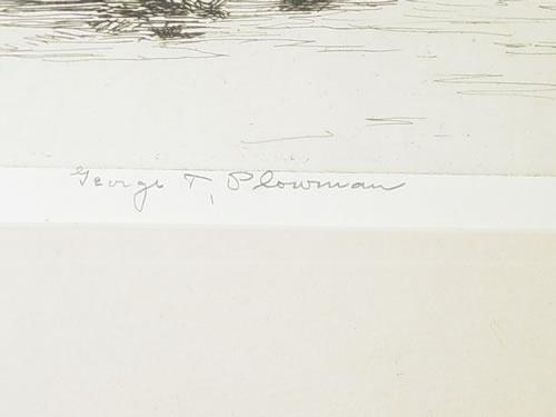 GEORGE T. PLOWMAN ETCHING OF A COVERED BRIDGE & STREAM-SIGNED GEORGE T. PLOWMAN, MATTED & FRAMED (6" X 9 1/2") - LIGHT TONING
