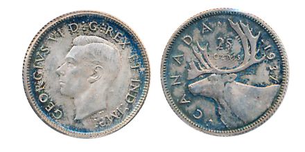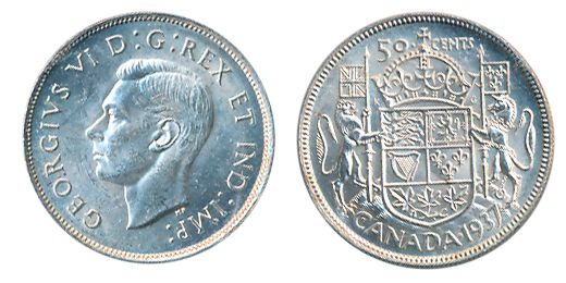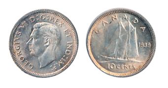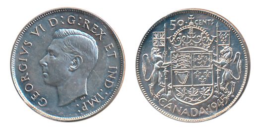 GEORGE VI LOT. TEN CENTS. 1939. ICCS Mint State-63; 25 CENTS. 1937. ICCS Mint State-63; 50 CENTS. 1937, 1945. Both ICCS Mint State-60. Lot of four (4) mint state coins.