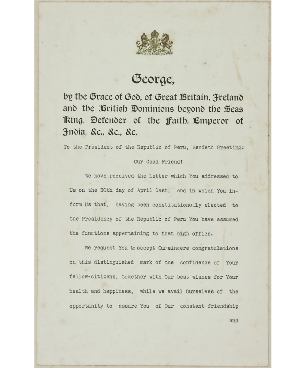 (1865 - 1936) King of England, son of Edward VII and husband of Mary of Teck who led England through the dark days of World War I and in the agreement with the Irish Free State. T.L.S. on official letterhead, 2pp. legal folio, St. James, Aug. 12, 1933, to the newly-elected President of Peru, Oscar Benavides. George sends congratulations on Benavides victory, adding: "...we avail Ourselves of the opportunity to assure you of Our constant friendship and of the lively interest which We take in all that conduces to the welfare and prosperity of the Republic over which you have been called to preside...". Boldly signed. Mounting remains to final page lightly affecting signature, slight soiling to first page, otherwise very good.