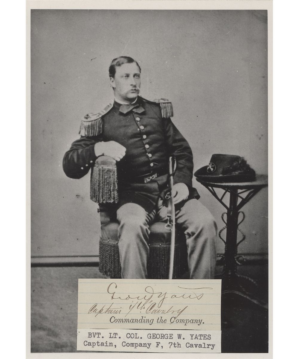 (1843 - 1876) American military officer, a captain in the 7th Cavalry commanding Co. F of the Dakota Column and killed at the Little Big Horn. Rare signature "Geo. W. Yates" with rank in another hand "Captain 7th Cavalry", cut from a document. Fine condition, mounted to a reprint of a photo of Yates in uniform. Overall fine.