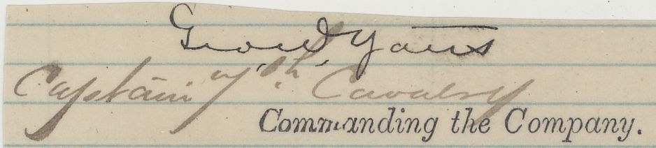 (1843 - 1876) American military officer, a captain in the 7th Cavalry commanding Co. F of the Dakota Column and killed at the Little Big Horn. Rare signature "Geo. W. Yates" with rank in another hand "Captain 7th Cavalry", cut from a document. A bit closely-cut at top, else fine condition.