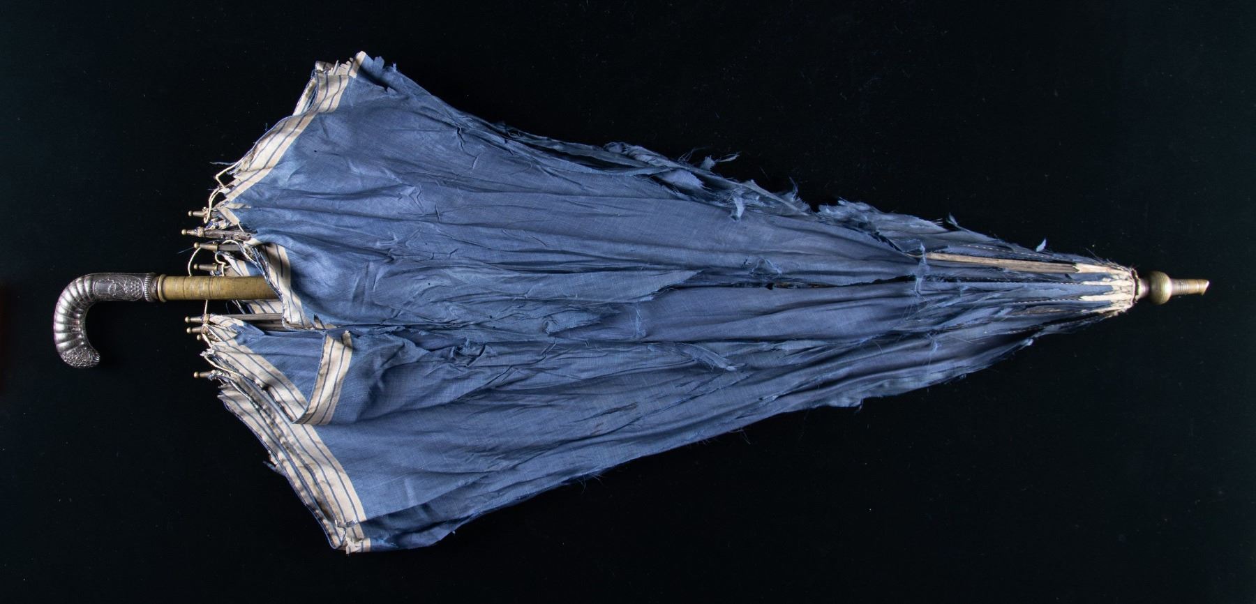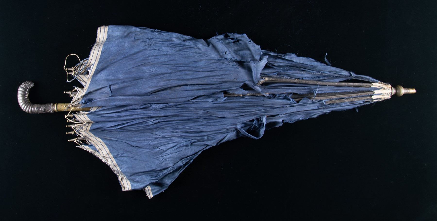 A truly historical parasol or umbrella measuring about 40" in length with a carved / pressed horn handle bearing a profile bust of our first president, General George Washington. "GEORGE" appears above the bust and "WASHINGTON" below. The other side bears a stunning American eagle above 13 stars with the words "E PLURIBUS UNUM" over its head. The tip of the ribbed handle is finished in a floral motif. The tip of the shaft and the end near the handle are brass with all the stays being baleen. The cloth is blue silk with a three line white border. Given the form and style of this parasol it appears, from a decorative arts point of view, to be manufactured from the early 1800s to about 1835, possible for the Golden Jubilee of America in 1826 or Washington's 100th birthday in 1832. CONDITION: the silk is very tattered, but this is likely the finest condition example extant. The handle decoration is easily discerned and very well done. There is a small crack in the handle commonly seen in early horn items. (02-25194/BF). $1000-2000.
