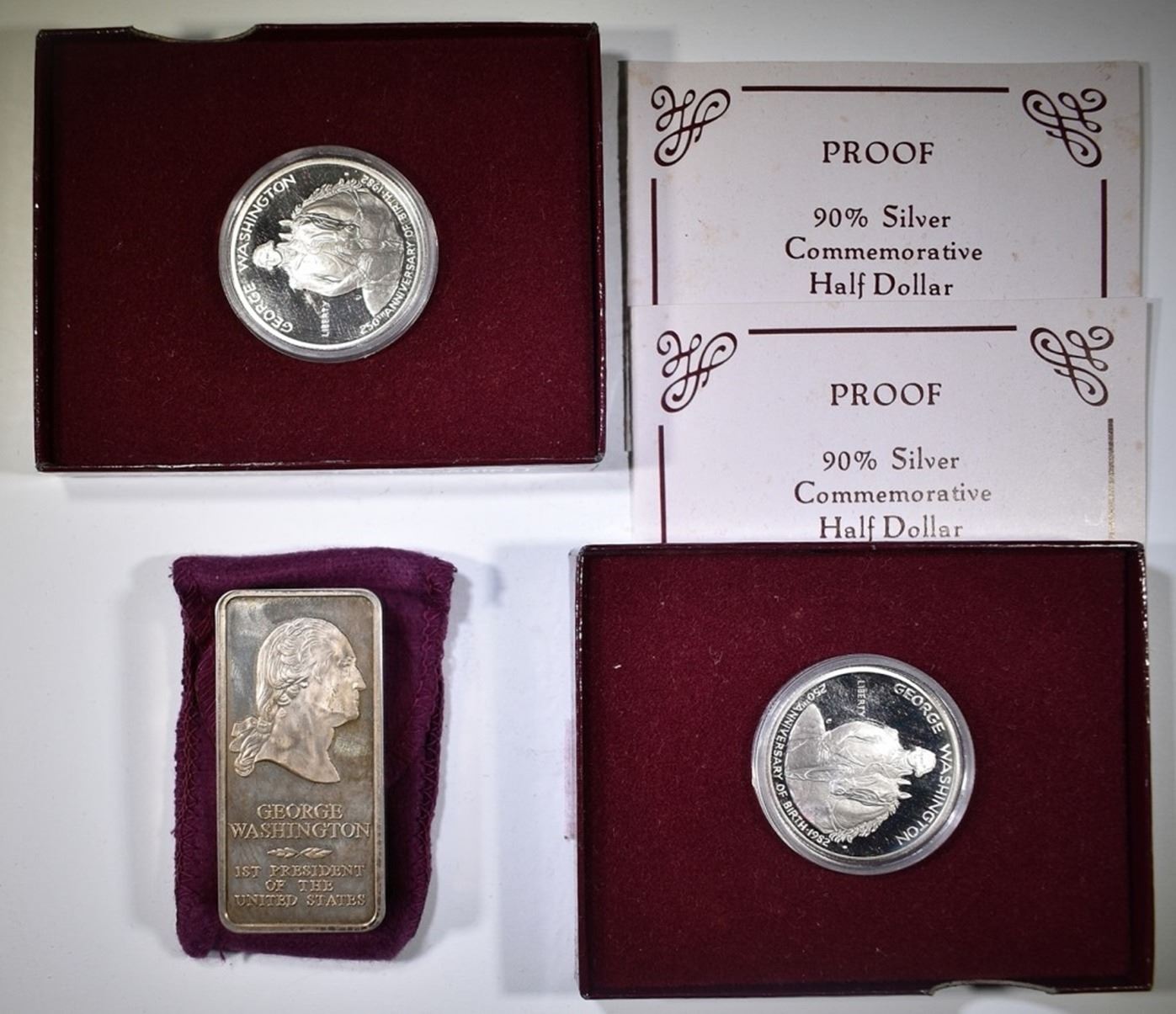 2-1982 PROOF HALF DOLLAR COMMEMS & 5.2 OZ STERLING SILVER 2500 GRAINS INGOT. ESTIMATE $150 - $175.