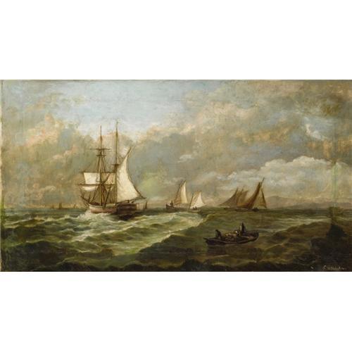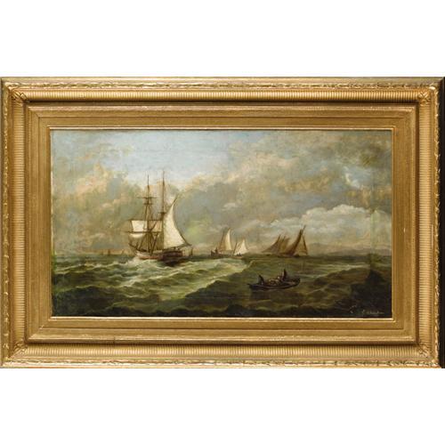 <B>GEORGE WASHINGTON NICHOLSON</B></I> (American 1832-1912)<BR><I>The Village Fleet</B></I><BR>Oil on canvas<BR>20 x 36 inches (50.8 x 91.4 cm)<BR>Signed lower right: <I>G.W. Nicholson</B></I><BR><BR> <B>Condition Report:</B> compromised, surface wear, craquelure throughout, overpainting, stretching crease from loose canvas<BR><BR><b>Shipping:</b> Requires 3rd Party Shipping (<a target="_blank" href="http://www.heritageauctions.com/common/shipping.php">view shipping information</a>)