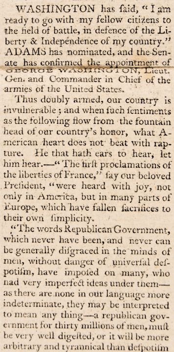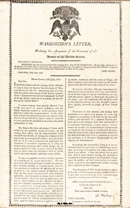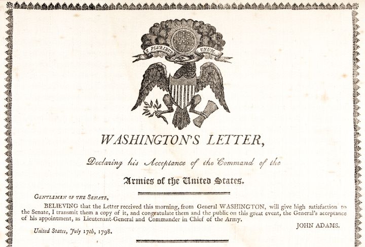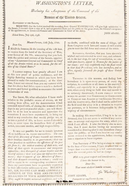 In 1798, President Adams asked George Washington to assume provisional command of the army, with the rank of Lieutenant General. He would be called to active duty as "it becomes indispensable by the urgency of circumstances."