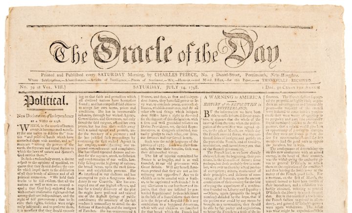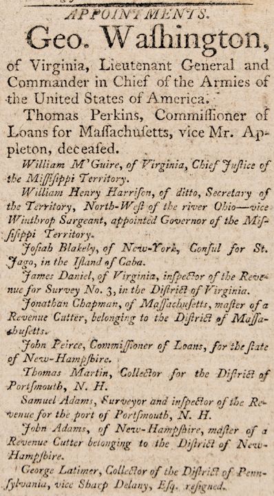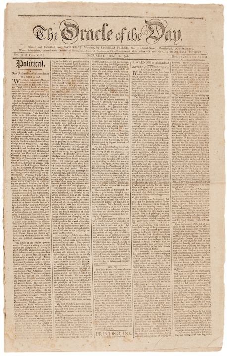 This Unrecorded Silk Broadside reprints George Washington's full letter below John Adam’s statement. Another version of this Broadside was printed on paper by J. Russell in 1798. This version was Printed by Charles Turell of Salem, Massachusetts in 1813. A written statement on the reverse of the frame shows it being presented to his namesake in 1860. It is also Accompanied by a July 14, 1798 dated Newspaper titled, "The Oracle of the Day," announcing George Washington's Appointment, in a report printed on page two. This likely Unique item is to the best of our knowledge, missing in every major collection. (2 items)