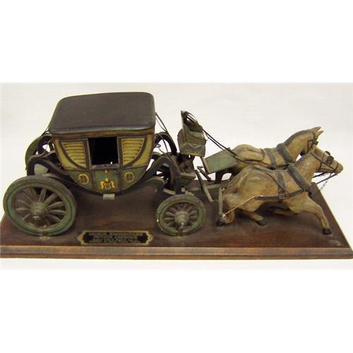 <table width="100%" border="0" cellspacing="0" cellpadding="4"><tr><td><em> </em></td></tr><tr> <td width="100%"> This is a model, already constructed of George Washington's Private coach. The coach is in very good shape for the age, just a few minor dings and a bit of missing paint. The worst thing on the model is the back leg of the right horse is broken, a clean break that can surely be glued easily. Colors are suttle brown and greens. The coach is very detailed with leather straps chains, curved frame and fancy drivers bench. a plate on the base say's "George Washinton's Private Coach, original built in England, now on Exhibition at Mount Vernon, Virginia. The model comes with a newspaper clipping from 1931 showing the model for sale for $4.98. A model any school boy can build, a great christmas present or profitable pastime. What a great Toy Model and piece of History. </td></tr><tr> <td> </td></tr><tr> <td>Reference #: jw7</td></tr><tr><td>Condition:Very Good</td></tr><tr><td>Year:30's</td></tr><tr><td>Country:USA</td></tr><tr><td>Maker:Historical Coach Models, Inc.</td></tr><tr><td>Height:8.25</td></tr><tr><td>Depth:8</td></tr><tr><td>Width:23</td></tr><tr><td>Weight:5</td></tr><tr><td>Title:GEORGE WASHINGTON'S PRIVATE COACH</td></tr><tr><td>Style:George Washingtons Private coach</td></tr><tr><td>Type:Model</td></tr><tr><td>Location:Portland, Indiana</td></tr></table>