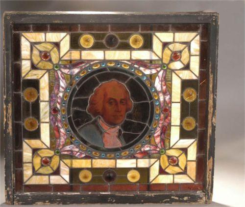 GEORGE WASHINGTON STAINED GLASS WINDOW 36"x38 3/4" late 19th century, condition: very good, some cracked pieces of glass at lower right.