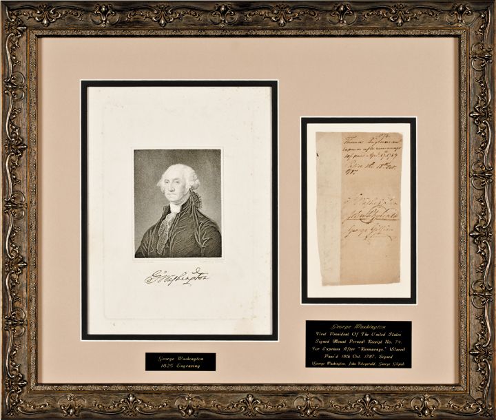 The document has some slightly deeper tone to about 75% of the original laid period paper, where the smaller portion was folded. All of the reverse side signatures are all squarely upon the larger portion, written in brown ink with “Go. Washington” clearly and fully readable yet a bit light. The entire reverse panel of the frame is hinged to open easily for full access, currently the signature side is displayed. An easy to insert Plexiglas reverse panel would allow for full viewing of both sides. Archival, professionally matted and framed under Plexiglas, this important, historic George Washington Signed Approved Payment Receipt for “Expenses After Runnaways” made to Overseer Thomas Boylan is ready to hang upon display.