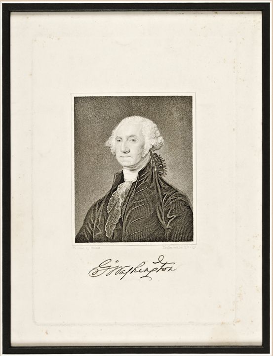 April 10th, 1787 & October 18th, 1787-Dated Docket Post Revolutionary War Era, Manuscript Document Signed, “Go. Washington” as President of the Potomack Company, Very Fine. This remarkable George Washington Signed, Endorsed Receipt, measures 3.5" x 6.5" being custom matted and framed to 17.5” x 20.75” along with an 1825 Engraving of Washington with facsimile signature below, after the famous painting by Gilbert Stuart, along with two informational gold-gilt engraved plaques located below both the document and print.