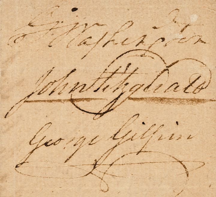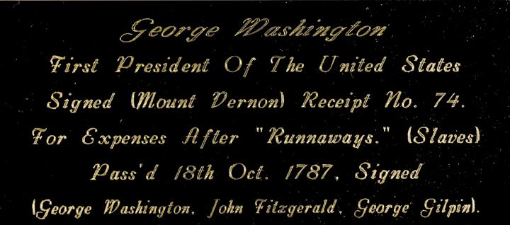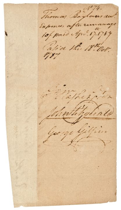 “No 74. -- Thomas Boylans acct. -- Expenses after runnaways -- 10S paid April 17th, 1787 -- Cas’d this 18th, Oct. 1787 -- (Signed) Go. Washington -- John Fitzgerald -- George Gilpin”.