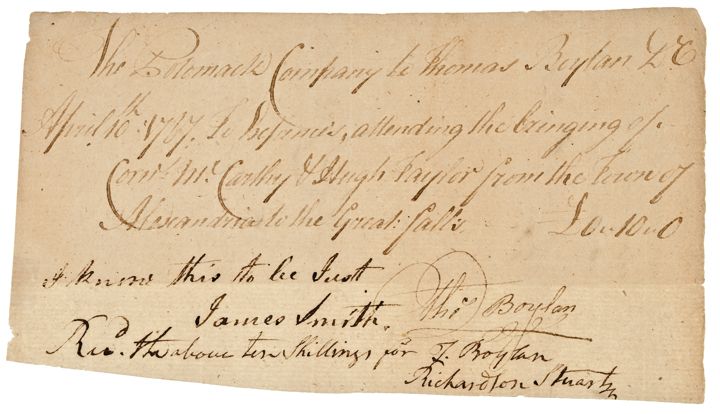 April 10th, 1787. - To Expenses, attending the bringing of Comr. McCarthy & Hugh Taylor from the town of Alexandria to the Great Falls -- £0.10.0 -- (Signed) Thos. Boylan.” Additionally noted at bottom left and below in another hand: “I know this to be Just. -- (Signed) James Smith.” Plus, endorsed for payment: “Rec'd. the above ten Shillings for T. Boylan -- (Signed) Richardson Stuart.”