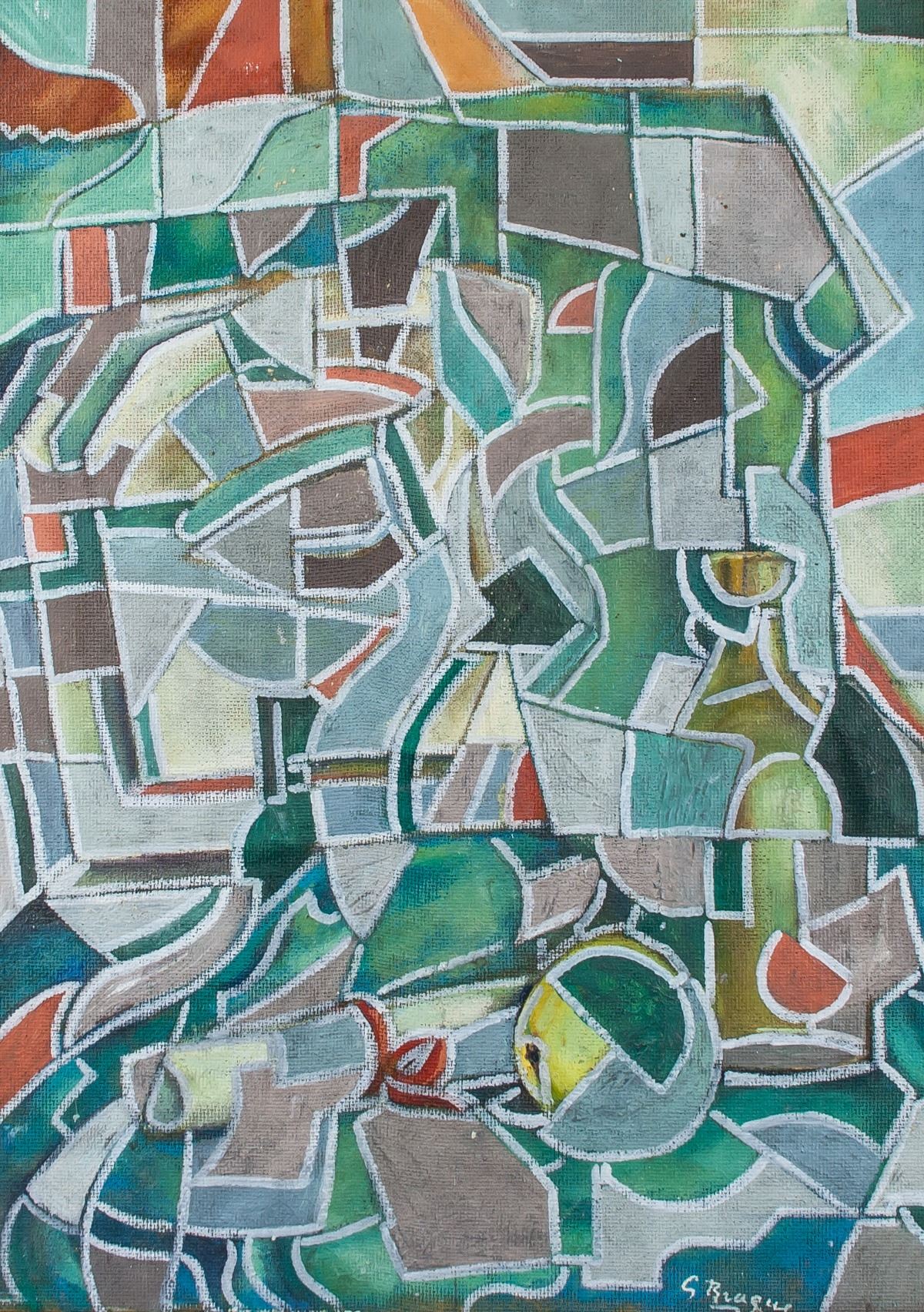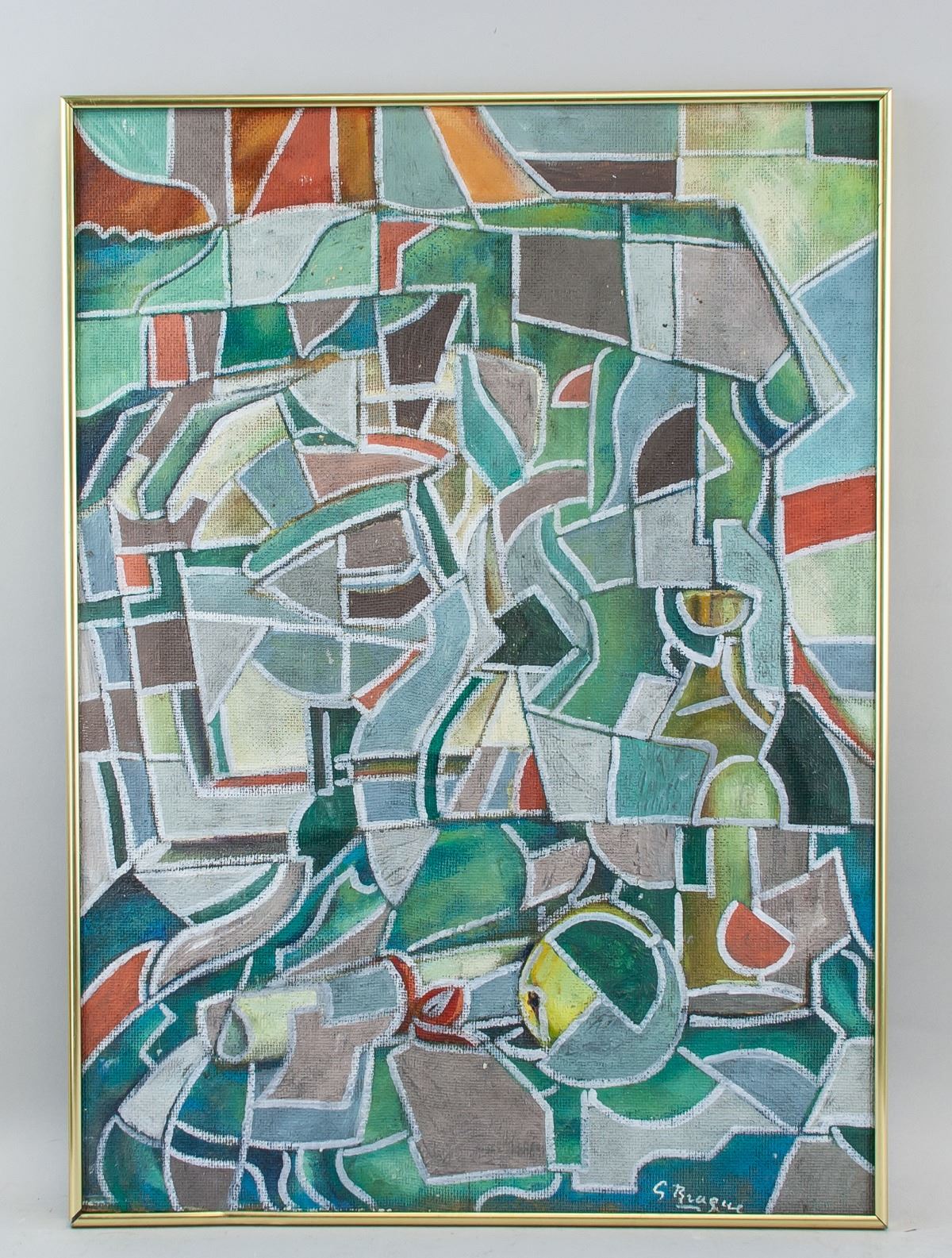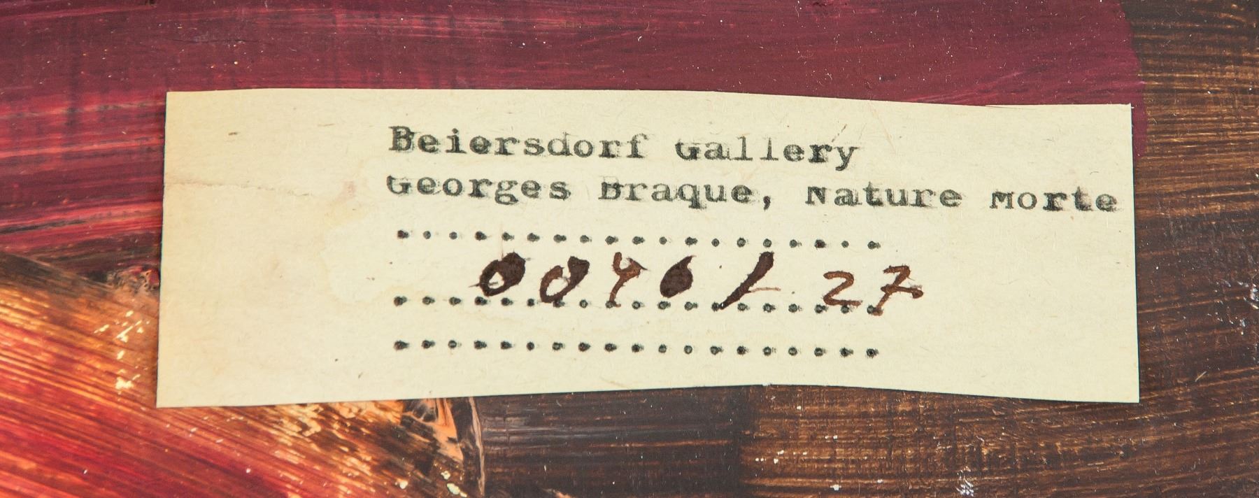 Oil on canvas. Featuring an abstract composition. Signed and attr. Georges Braque (French, 1882-1963) on the lower right corner. Gallery label and entitled, "Nature Morte" inscribed on verso. 54 x 39 cm (21.3 x 15.4 inches). Georges Braque was at the forefront of the revolutionary art movement of Cubism. Braque's work throughout his life focused on still lifes and means of viewing objects from various perspectives through color, line, and texture. While his collaboration with Pablo Picasso and their Cubist works are best known, Braque had a long painting career that continued beyond Cubism. PROVENANCE: Beiersdorf Gallery. Private estate, Circa 2000s (Central Europe). PROVENANCE: Beiersdorf Gallery. Private estate, Circa 2000s (Central Europe).