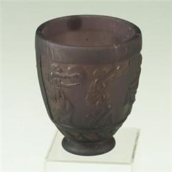 GEORGES DE FEURE (French, 1868-1943) molded amethyst glass urn with paneled frieze in relief of classical women dancing and playing musical instruments. Scratches and small chips to body. Signed G. de Feure. 5 1/2" x 4 3/4" dia. $300 - 500
