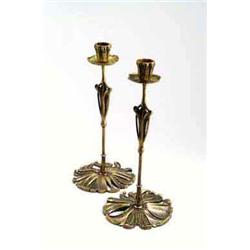 GEORGES DE FEURE, Paris Paar Leuchter, Bronze. Tellerfuß als Blüte gebildet, Schaft in Form eines St䨨ngels mit stilisierten Blättern, darüber Traufschale mit Tülle in vegetabilen Formen, partiell durchbrochen gearbeitet. H.: 28,5 cm. Unbezeichnet. Um 1900 Lit.: Uecker, W., Lampen und Leuchter, Art Nou-veau, Art Déco, Herrsching 1978, Abb. S. 83, Nr. 0121