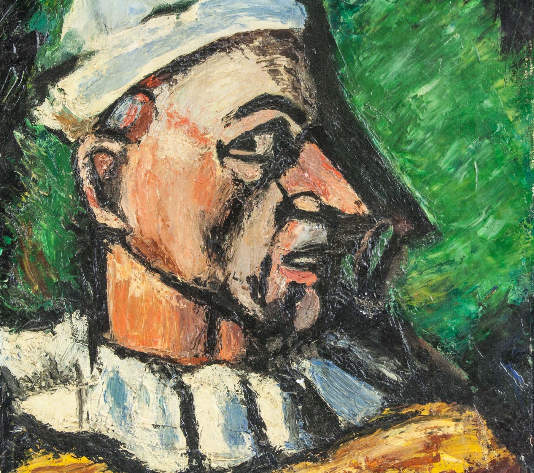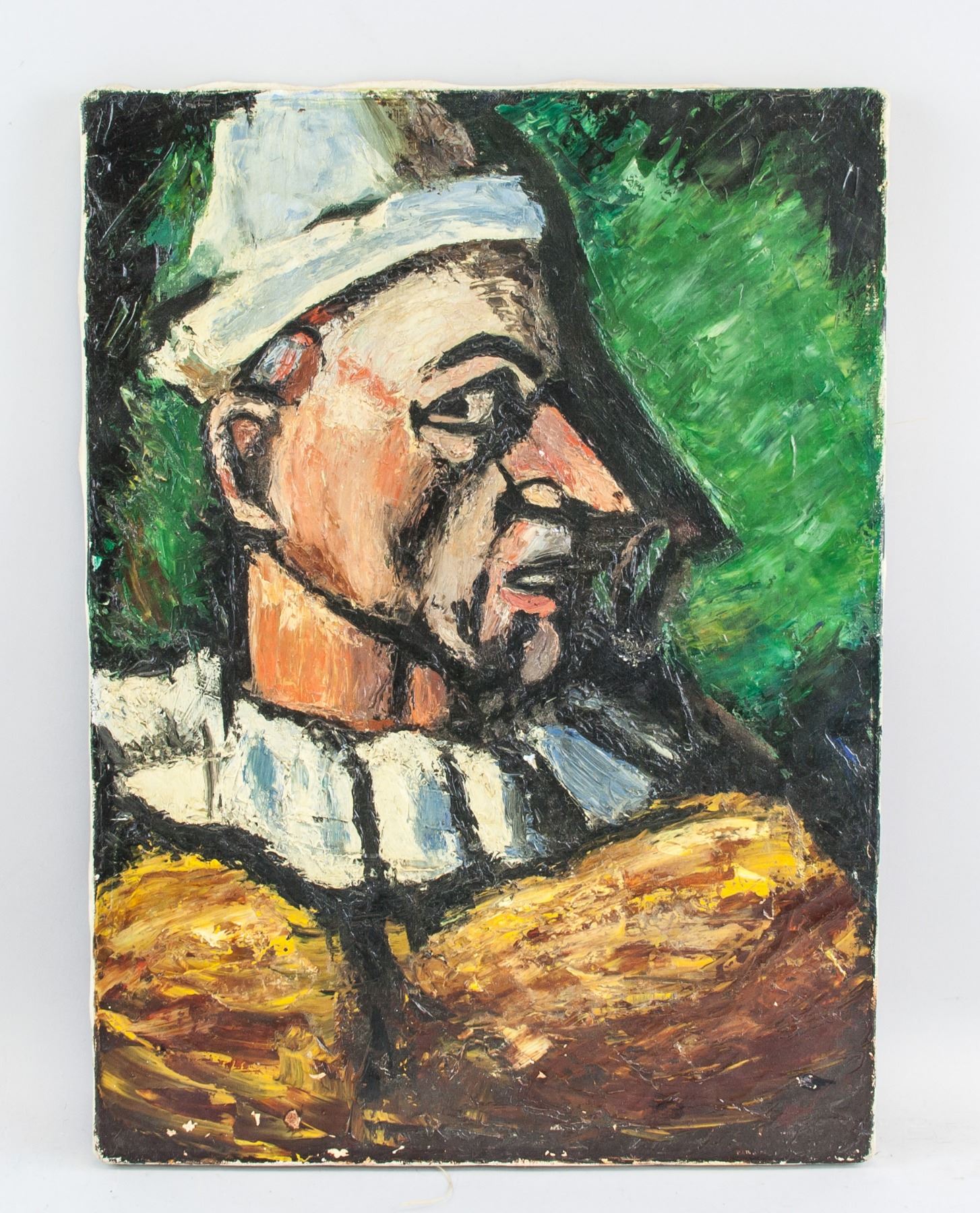 Oil on canvas. Signed and attr. Georges Rouault (French, 1871-1958). 18 x 13.25 in. (45.7 x 33.7 cm). A repaired hole to the right of the figure's chin. A pioneering expressionist painter (influenced by the German Expressionists, though not formally associated with that group), Georges Rouault created pictures recognizable for the thick black brushstrokes that outline their subjects, as in le lutteur, no. 3 (1913). Rouault’s works resemble the cloissonisme of decorative glasswork, a look often attributed to the artist's teenage years spent as a glass painter’s apprentice. In 1891 Rouault enrolled at the Ecole des Beaux-Arts and studied closely under Symbolist Gustave Moreau. He later associated with the Fauvists and collaborated with Henri Matisse and André Derain to organize the Salon d’Automne, an exhibition of progressive art rejected by the more conservative Paris Salon. But rather than create pleasing “armchair” pictures like those of many of his contemporaries, Rouault applied his rough painterly style to religious subjects, clowns, and circus performers, using these motifs to reflect on religion, morality, and modern life. PROVENANCE: Private Collection (San Francisco, United States)