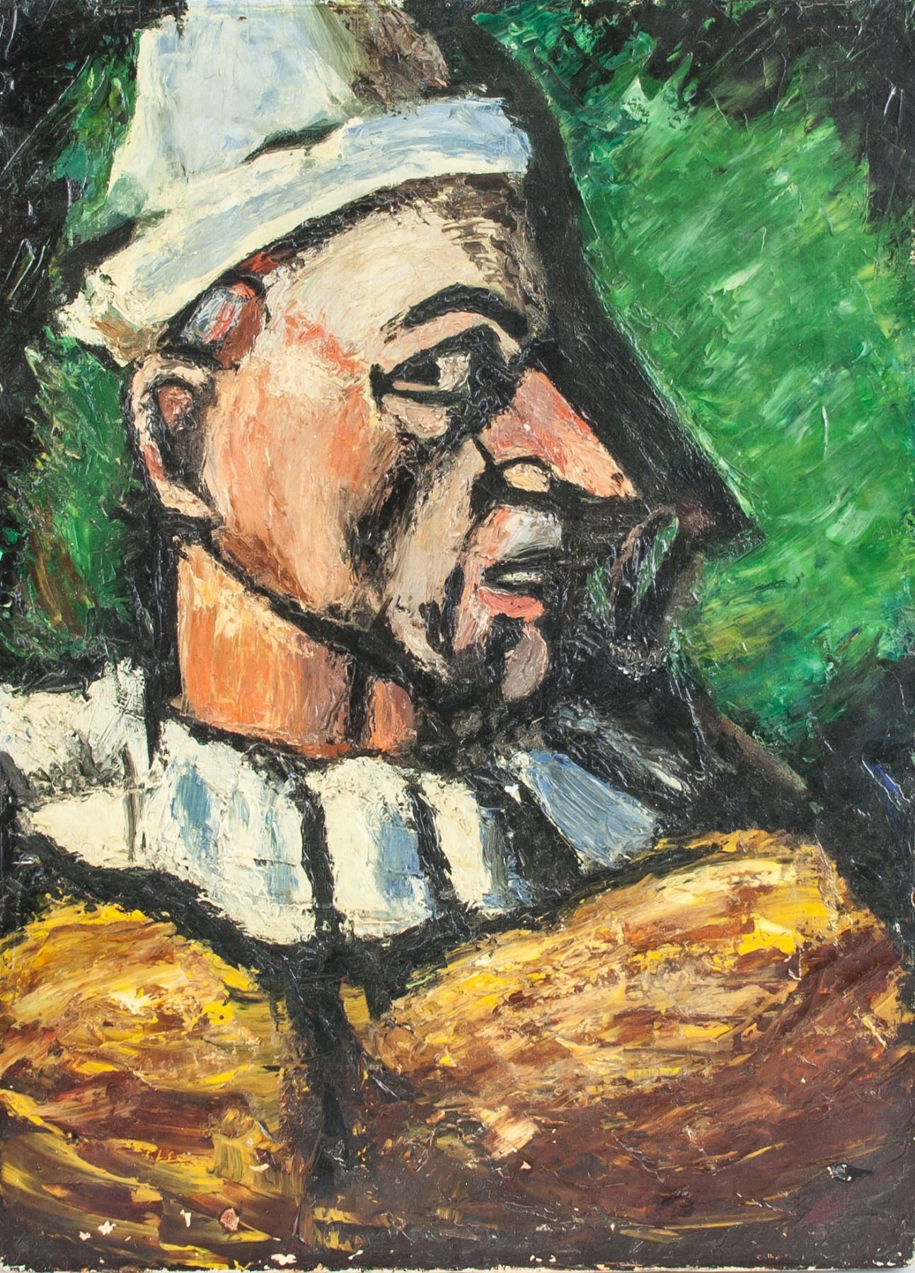 Oil on canvas. Attributed to Georges Rouault (French, 1871-1958). 18 x 13.25 in. (45.7 x 33.7 cm) A repaired hole to the right of the figure's chin. A pioneering expressionist painter (influenced by the German Expressionists, though not formally associated with that group), Georges Rouault created pictures recognizable for the thick black brushstrokes that outline their subjects, as in le lutteur, no. 3 (1913). Rouault’s works resemble the cloissonisme of decorative glasswork, a look often attributed to the artist's teenage years spent as a glass painter’s apprentice. In 1891 Rouault enrolled at the Ecole des Beaux-Arts and studied closely under Symbolist Gustave Moreau. He later associated with the Fauvists and collaborated with Henri Matisse and André Derain to organize the Salon d’Automne, an exhibition of progressive art rejected by the more conservative Paris Salon. But rather than create pleasing “armchair” pictures like those of many of his contemporaries, Rouault applied his rough painterly style to religious subjects, clowns, and circus performers, using these motifs to reflect on religion, morality, and modern life. PROVENANCE: Private Collection (San Francisco, United States)