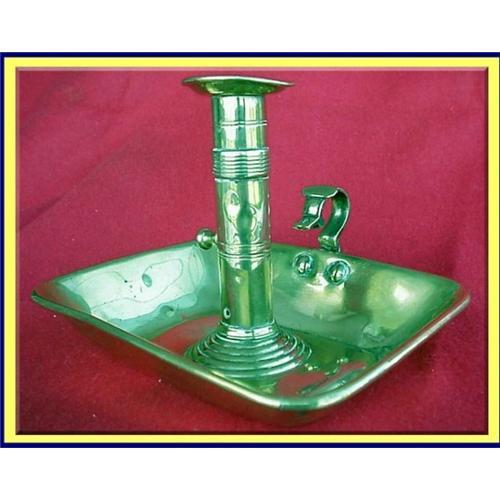 Deep golden coloured brass. A walled tray with concave, sloping sides with a central, mechanical candle stick. Lever to raise or lower the candle (see 'photos). Hooked thumb piece attached to back.