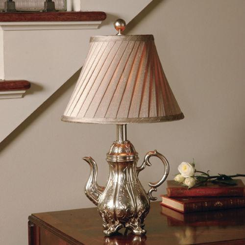 Classic English teapots have been reinterpreted into gorgeous accent lamps. This English teapot lamp is carved with a detailed antique silver design with 4 embellished feet and an exaggerated oval shaped handle with taupe seeded silken shade.