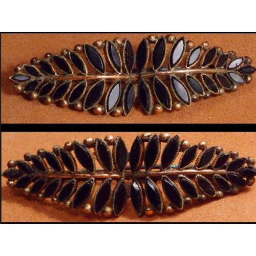 This is part of the jewelry we bought years ago from a Georgia Estate. It is made with hand set black jet stones and made in the dimensional shape of a bow. It is 2 1/3" long and is complete hand worked. from the early 1800?s this is a really unique and beautiful piece of artistry. Has not been cleaned or polished. Some stones are not perfect.