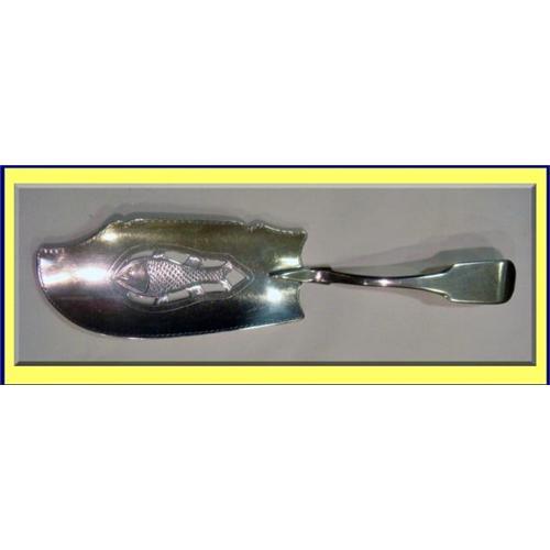 Slightly scoop-shaped, in order to hold fish more securely and possibly to catch a bit of gravy. Classic scrolling, assymetrical serving shape with delicate engraved pattern on the edges, typical of the Georgian period. The center has an openwork decoration of a fish, with wonderful engraved detail to fins and scales. The handle forms one piece with the scoop/ladle, with additional support in a raised, pointed V on the top. Rat-tail back of handle. <P><P>