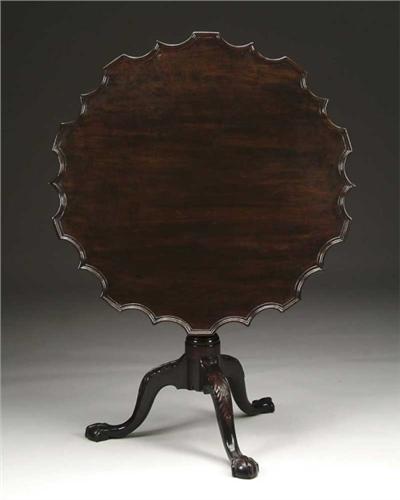 GEORGIAN PIE CRUST TILT TOP TEA TABLE. Nicely carved pie crust edge top. Carved ball turned shaft supported by three outstretching snake legs ending in flat ball and claw feet. SIZE: 28-1/2” h x 32-1/2” 33” top. CONDITION: Professionally restored, very good. 9-27083