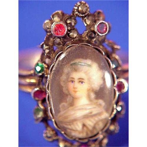 Gorgeous Rare Georgian 19C French Ring Miniature & Gems Antiques:Silver Absolutely one of the most beautiful antique rings we have seen in a long time. This is from the first quarter of the 19th century 1800-25, French made possibly by a skilled & talented French Jeweller Fromant Meurice. There 2 makers? mark but very difficult to make out, however the quality is in keeping with his work. This is an authentic antique ring absolutely NOT a reproduction. The ring is silver with a gorgeous hand painted miniature of a beautiful lady, looks to be very much like Marie Antoinette, this lovely lady is under a carved rock crystal front and surrounded by gemstones Rubies, Pink Sapphires, Emeralds, and cut steel (a favourite of this time period). The surround is made of posy like flowers with the gems being in the centres. The ring size is about an 8. The overall condition is excellent, no damage to the crystal, just wonderful! These are so difficult to find now, rarely being offered for sale. If you love true antique miniatures, or Georgian Regency pieces, you will cherish this divine ring, it is gorgeous!